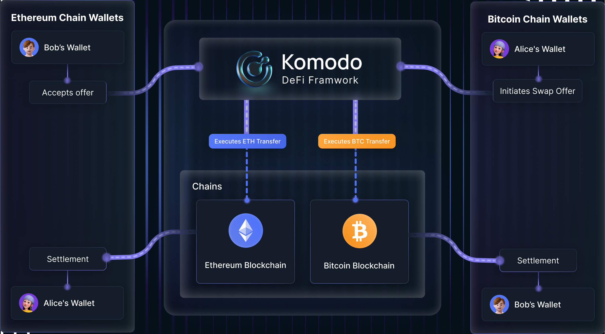 The following diagram shows how Komodo’s DeFi Framework facilitates an atomic swap between two blockchains - in this case, Bitcoin and Ethereum. It visualizes the interaction between users’ wallets, the swap execution layer and the settlement on each chain.